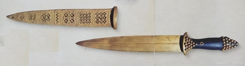 这柄宝剑有4000年历史。是苏美尔普阿比王后的佩剑,剑身和剑鞘都用黄金(密度19.26g/cm3)铸造,剑柄是蓝色的天青石(密度4g/cm3),以黄金装饰,长约25CM,重约950克,剑柄重量约是剑重的十分之一,光铸造这把剑所用黄金,按现价就是25万元人民币,但这可是4000多年前的金子啊,其文物价值要高于明朝龙柄金剑,故这把金剑比明朝龙柄金剑值钱。