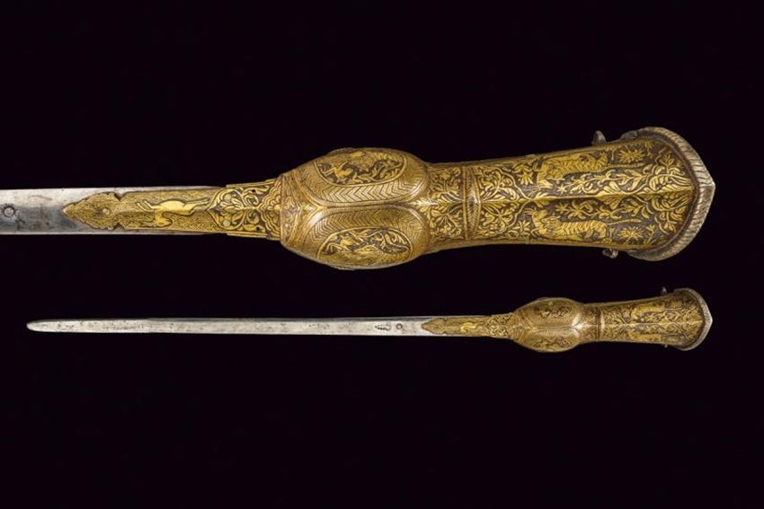 印度镀金套筒剑。这把剑制造于1800年,是印度一种非常厉害的剑,剑柄为套管式,其上镀金蚀刻图案。这样的装饰,使这把剑在同款剑中显得华贵。剑刃软短,但很锋利,可以破甲。使用时,将剑柄套在手臂上,手握套筒内的横梁刺击。套筒可以保护手和腕部,使攻击更为方便。这把剑杀伤力很强,但却不值钱。