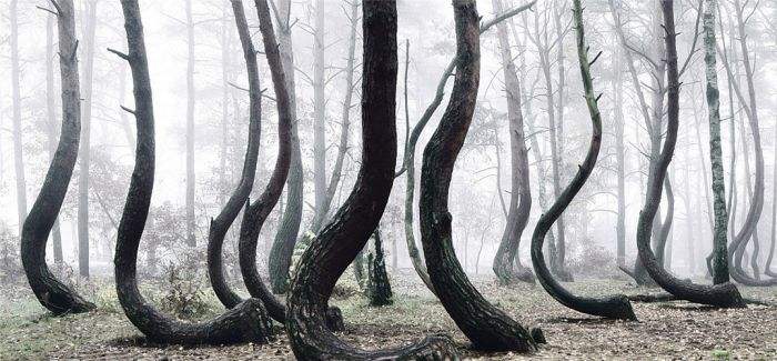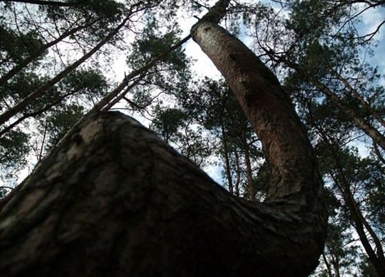 这片树林在当地被称作弯曲森林,大部分树木开始都是平行于地面的生长,到一定时间才90度拐弯向上。