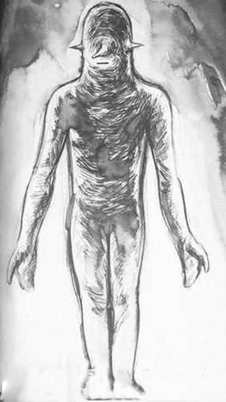 然后从该物体飘出来3个身高大约150厘米的“类人”,他们没有脖子、皮肤是灰色,有皱纹。