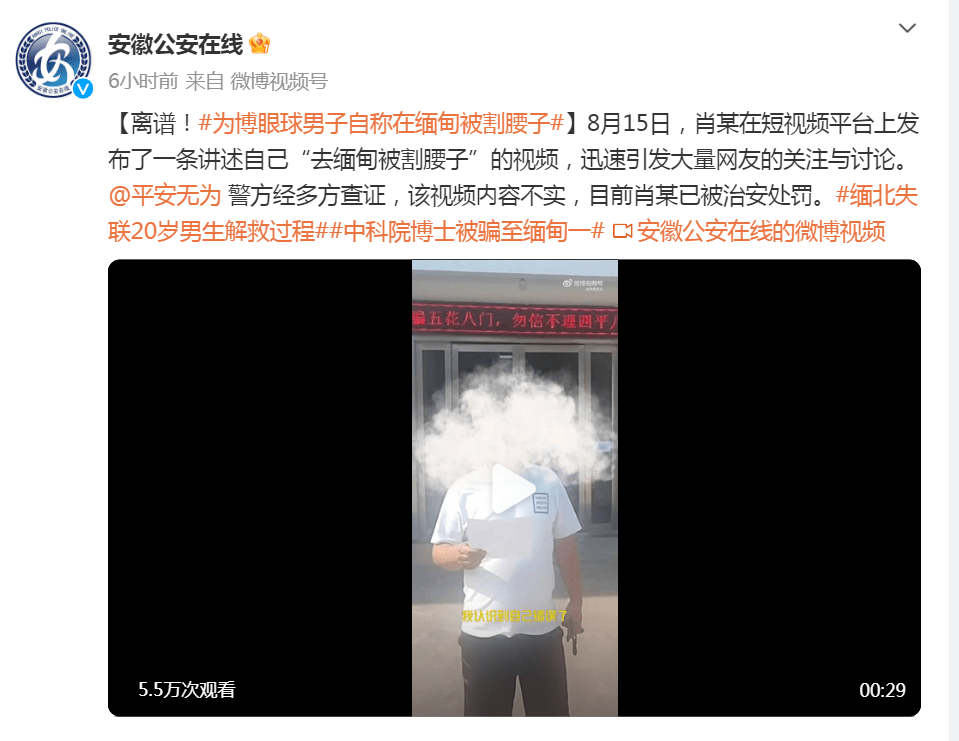 据安徽省公安厅官方微博8月18日发布的信息,8月15日,网民肖某在短视频平台上发布了一条讲述自己“去缅甸被割腰子”的视频,迅速引发大量网友的关注与讨论。 安徽省无为市警方经多方查证,该视频内容不实,目前肖某已被治安处罚。