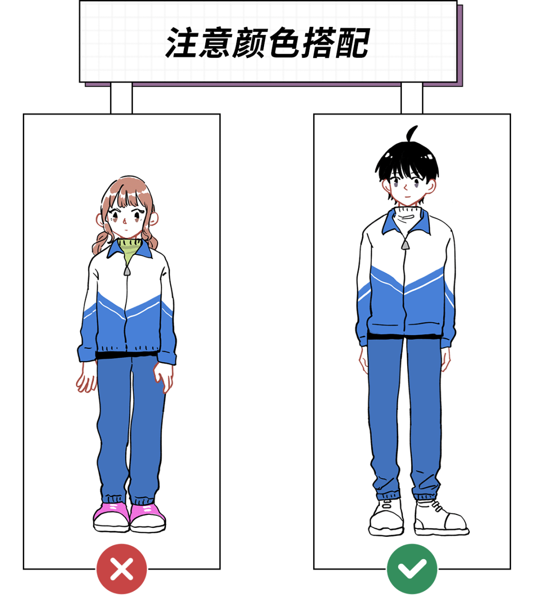 如果你在校服里面搭配一些衣物,要注意颜色的搭配,因为人们会看到整体的色彩。鉴于校服通常是饱和度较高的颜色,最好不要再搭配补色的衣物。