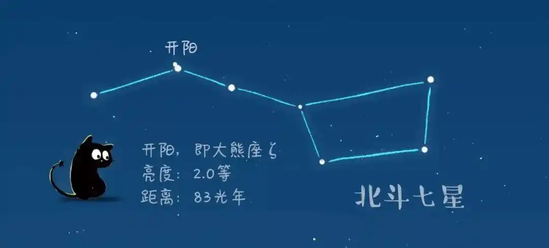 北斗七星常年可见,开阳星位于勺子柄部第二颗