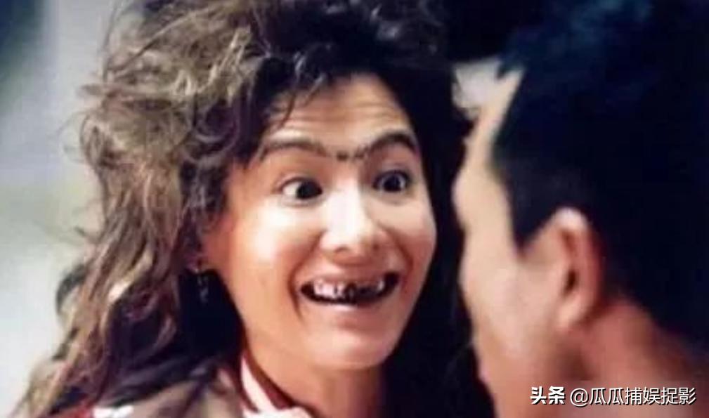 《食神》里的惊艳造型,夸张的大龅牙,一头杂草一样的头发和眯缝的眼睛。着实是丑得触目惊心啊。