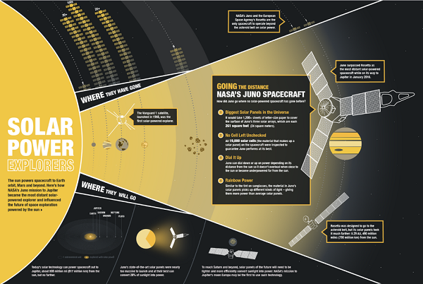 由于外太阳系光照微弱,之前前往这里进行探测的飞船都使用了“放射性同位素温差发电器”(RTGs),但是和这些探测器都不同的是,朱诺竟然使用了太阳能电池帆板作为能源。