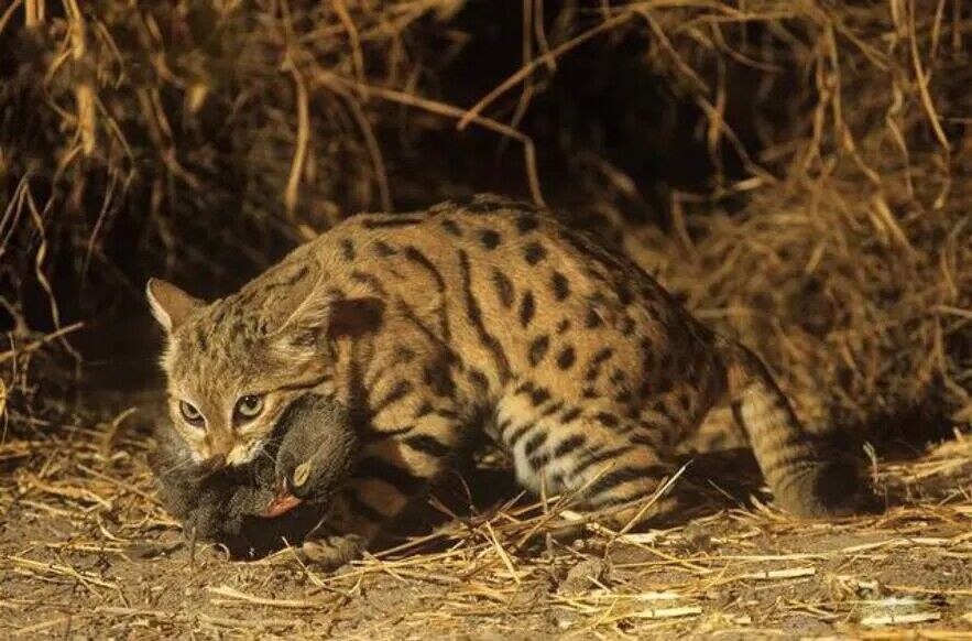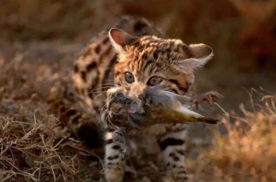 黑足猫捕猎讲究快准狠的策略,一锁定目标,就会立马抓住对方的命脉,捕食过程是连摄像机都无法快速记录下来的,因为黑足猫捕食速度实在惊人。
