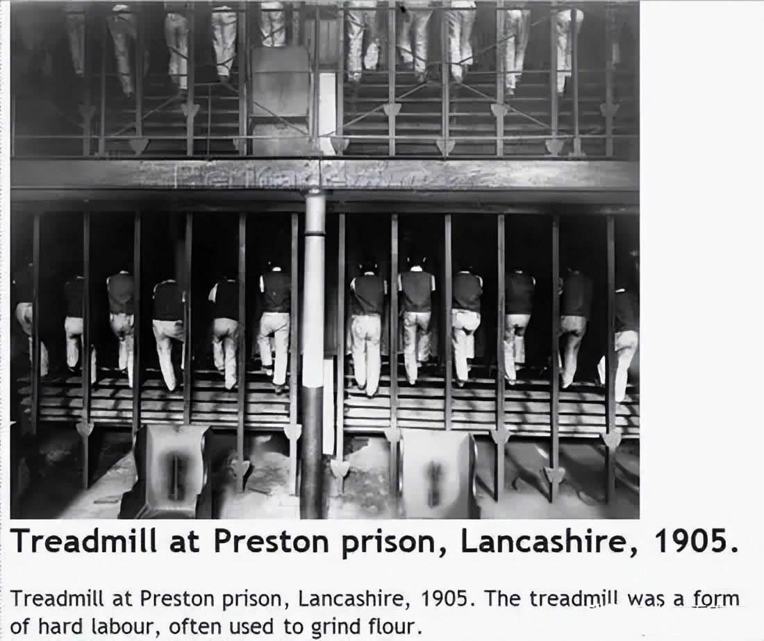 19世纪,英国为了解决罪犯精力旺盛,聚众闹事,发明了监狱版跑步机。犯人每天都要在跑步机上走6至8小时,不得停歇。效果极好,犯人踩跑步机,渴了没水喝,饿了没食物,吃累了也不准休息,甚至直接侧倒在跑步机上,再也没能起来,更别提还有力气闹事了。