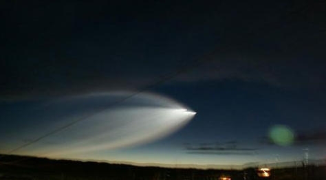 联盟U型运载火箭向东北方向飞行一段时间,就进入了中国塔 城、克拉玛伊、喀纳斯等北疆地区目击者的视野,该运载火箭第二级一子级的四个喷口喷射出的推进气体尾焰在箭体自旋转时易于在平面上看作五束光来,二子级为 稳定入轨自旋转加快,则尾焰及气体颗粒物就会呈螺旋形。