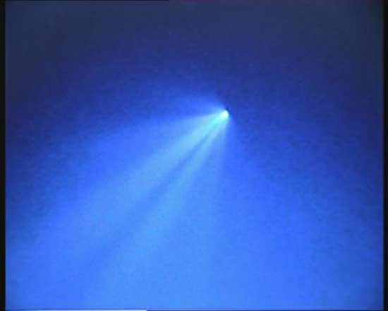 稍后,这五道光束组成的扇形光尾逐渐消失,发光体头部由亮变暗又由暗变亮,并变成螺旋状,快 速地向北飞去。