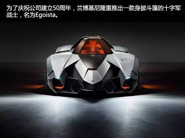 迈入二十一世纪,与兰博基尼岁数一同成长的还有神经病设计师的审美观。为了庆祝公司建立50周年,兰博基尼隆重推出一款身披斗篷的十字军战士,名为Egoista 。该词在意大利语里为“自私”之意,恰好与其单人座的设定遥相呼应。