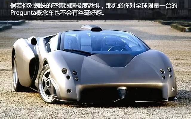 倘若你对蜘蛛的密集眼睛极度恐惧,那想必你对全球限量一台的Pregunta概念车也不会有丝毫好感。即使它外形与帕加尼Zonda甚为相像,但也无法改变人们对它非爱即恨的极端情形,因为前大灯的设计实在过于奇葩。