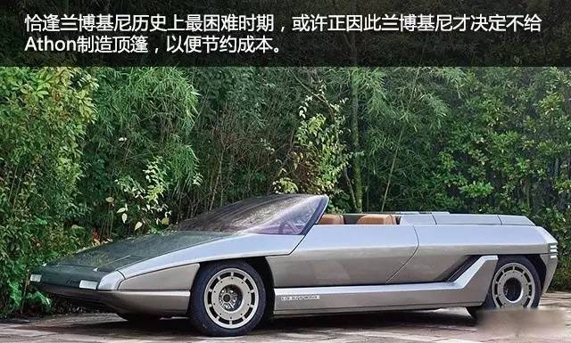 那由Silhouette底盘衍生而来的Athon又有能耐可栖息于博通博物馆,全因其外观极尽滑稽之能事?很大程度上还真得益于此,不过主要还是因为Athon是博通为兰博基尼设计的概念车。Athon首次展示于1980年都灵车展,当时兰博基尼正处在历史上最困难时期,或许正因此兰博基尼才决定不给Athon制造顶篷,以便节约成本。最终兰博基尼在1980年2月28日宣告破产,而Athon自然也就投产无望 。