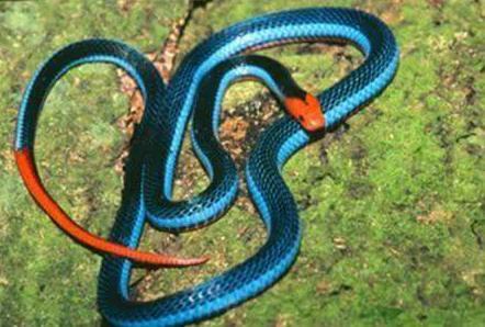 属于袜带蛇中的一种,而其色彩属于其中最美的一种,鲜艳的红蓝色和黑边的搭配,非常吸引眼球。这种蛇体长一般不超过60厘米,无害。