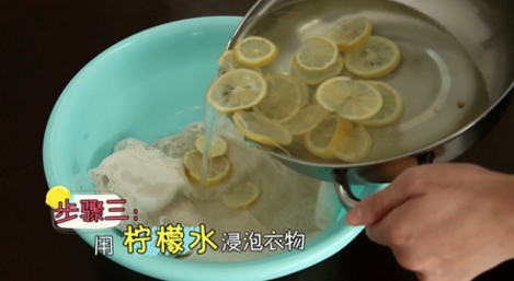 清洗白色衣服时,在热水中加入半杯柠檬汁,然后把衣服泡在水中一小时以上,之后换成清水,正常清洗衣服即可,这样白色衣服变黄的部分就能祛除了,如果用柠檬水清洗没有发黄的白色衣物,可以使其更加干净、洁白。