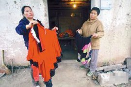死者身着红色的花裙子,双手、双脚被绳子严严实实地捆着,脚上还吊着秤砣,双手被挂在屋梁上。