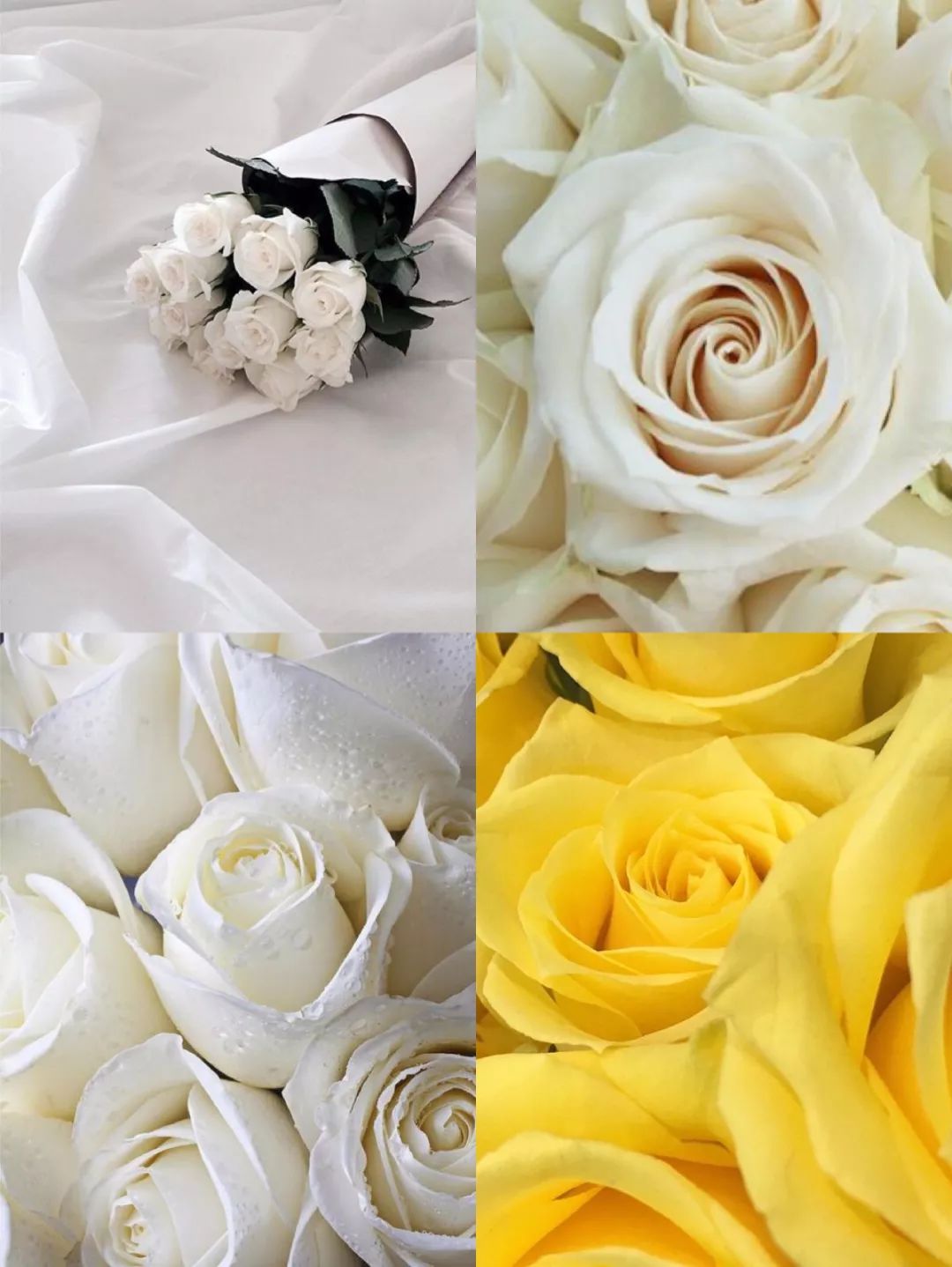 白玫瑰可以分为坦尼克和芬德拉两种。坦尼克泛绿,而芬德拉则表现出干净的奶油质感,看上去让人无法抗拒。黄玫瑰又分为金枝玉叶和金香玉两个品种,个人推荐金枝玉叶,因为它基本上没有味道。金香玉花苞小,有网套,味道浓,运输过程中容易出现烂瓣现象