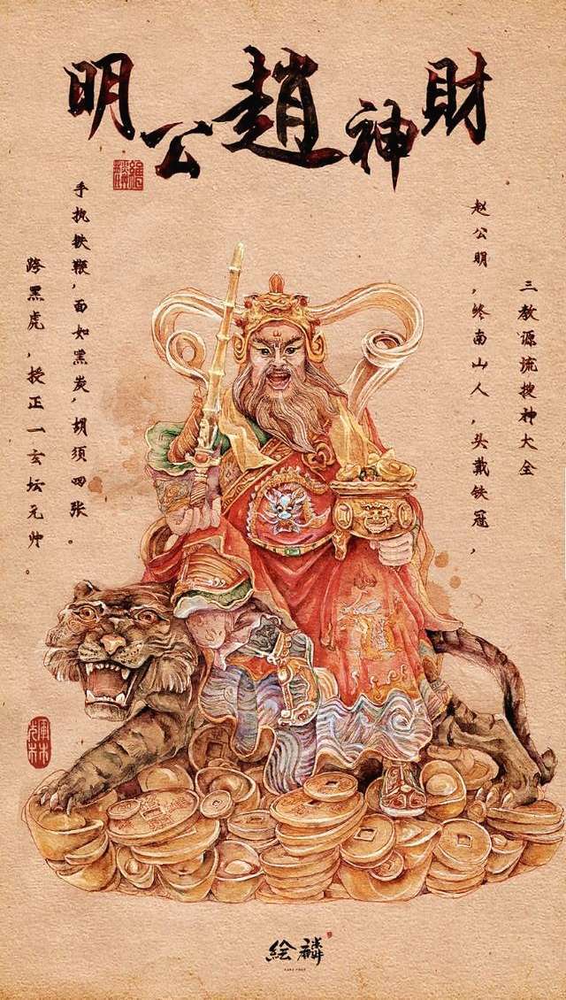 武财神有两种:一种是黑口黑面的赵公明,另一种是红面长髯的关公。赵公明威风凛凛,是个著名的猛将,民间传说他能够伏妖降魔,也能招财利市,因此许多北方商户都喜欢供奉它。南方商户则大多供奉关公。