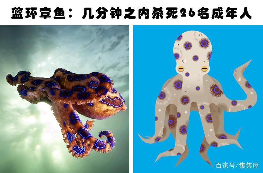 蓝环章鱼的大小就跟高尔夫球的大小一样,他喷射出的毒液可以杀死26个人左右,被注入毒液的人有可能会肌肉无力甚至麻木,最终可能死亡。