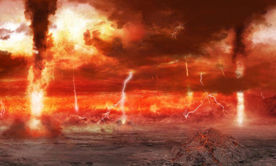 地球形成于大约45.5亿年前,由于频繁碰撞和内部放射性物质的衰变,导致地球内部温度极高,几乎所有物质都处于熔融状态。因此,地球经历了重力分异,形成了地核、地幔和地壳,并产生了现代地球大气层的雏形。那时的地球表面被熔岩覆盖,呈现出猩红色,犹如“地狱”一般。