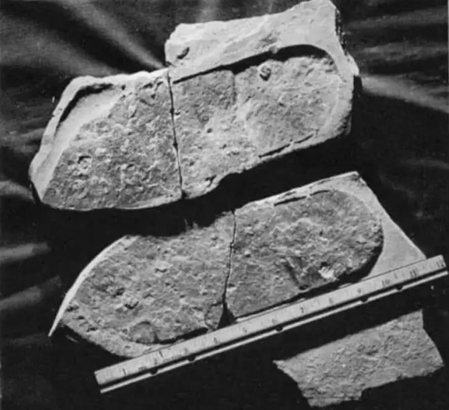 1968年的时候,一个喜欢收集化石的爱好者在美国,发现了许多三叶虫的化石。后来,在一块巨大的岩石里,他无意中发现了一具三叶虫的化石。更让他感到惊讶的是,在这只三叶虫化石上,竟然还有一只完整的脚印。这是一双和现在的鞋子一样的鞋印,长28厘米、宽8.5厘米。